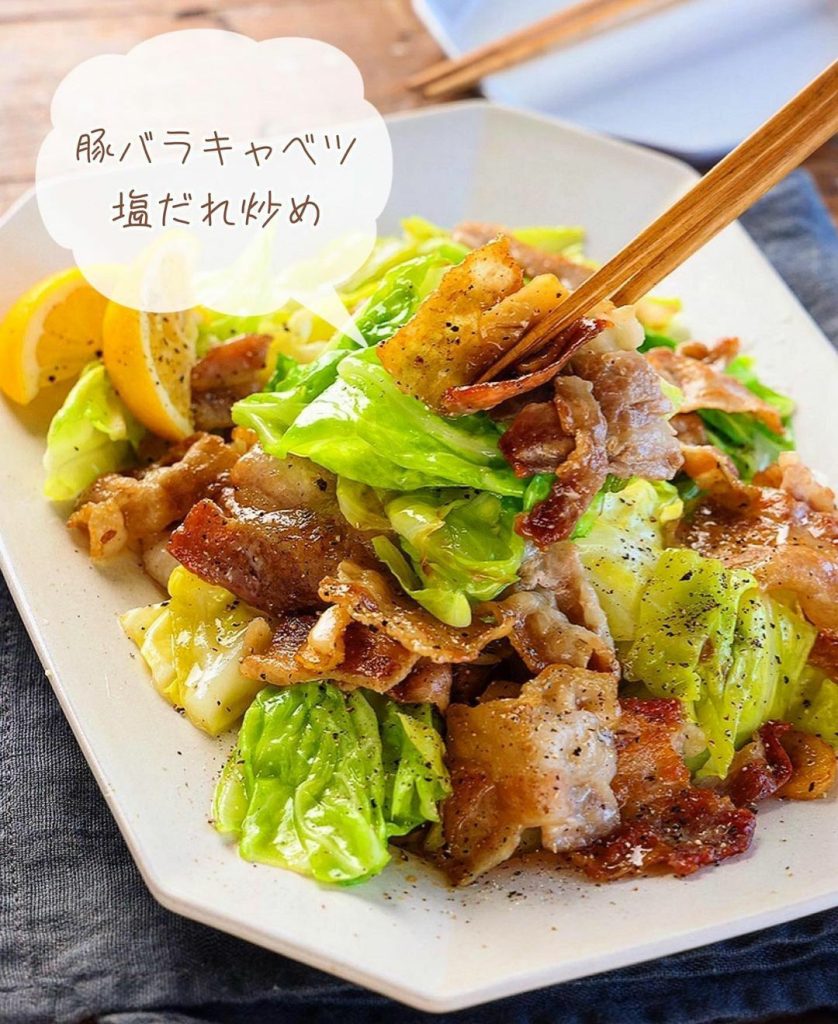 ①豚バラキャベツの塩だれ炒め