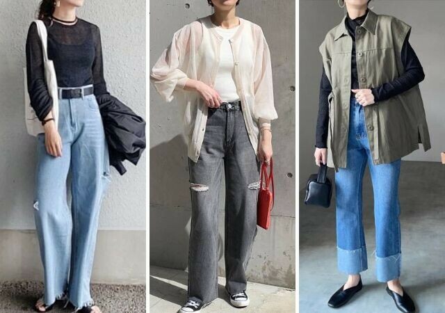 今季トレンドのボリュームのあるデニムコーデは、コンパクトなトップス合わせが間違いありません。とくに大人は黒を合わせると、シンプルでメリハリのあるおしゃれが完成。シアーなトップスだと重見えも回避できます。