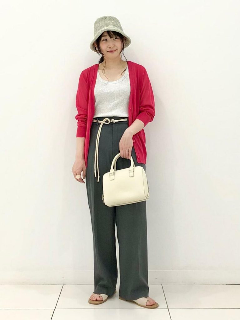 接触冷感の素材で、羽織ってもさらりと涼しいカーディガン。夏になると冷房で屋内は涼しいので、羽織りが重宝します。ほんのり透け感があり、見た目も着心地も涼やかです。ピンクは鮮やかな色で目を惹きます。