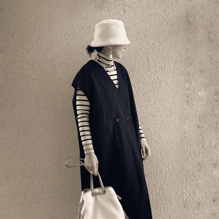 シューズ¥3,990(ユニクロ ユー/ユニクロ)コート¥49,940(ネイヴ/ネイヴ〈オンワード樫山〉)ワンピース¥47,300(スタンブリー/ヒューエルミュージアム ギンザシックス)バッグ¥83,820(カフネ)ピアス¥166,900(MAAYA)