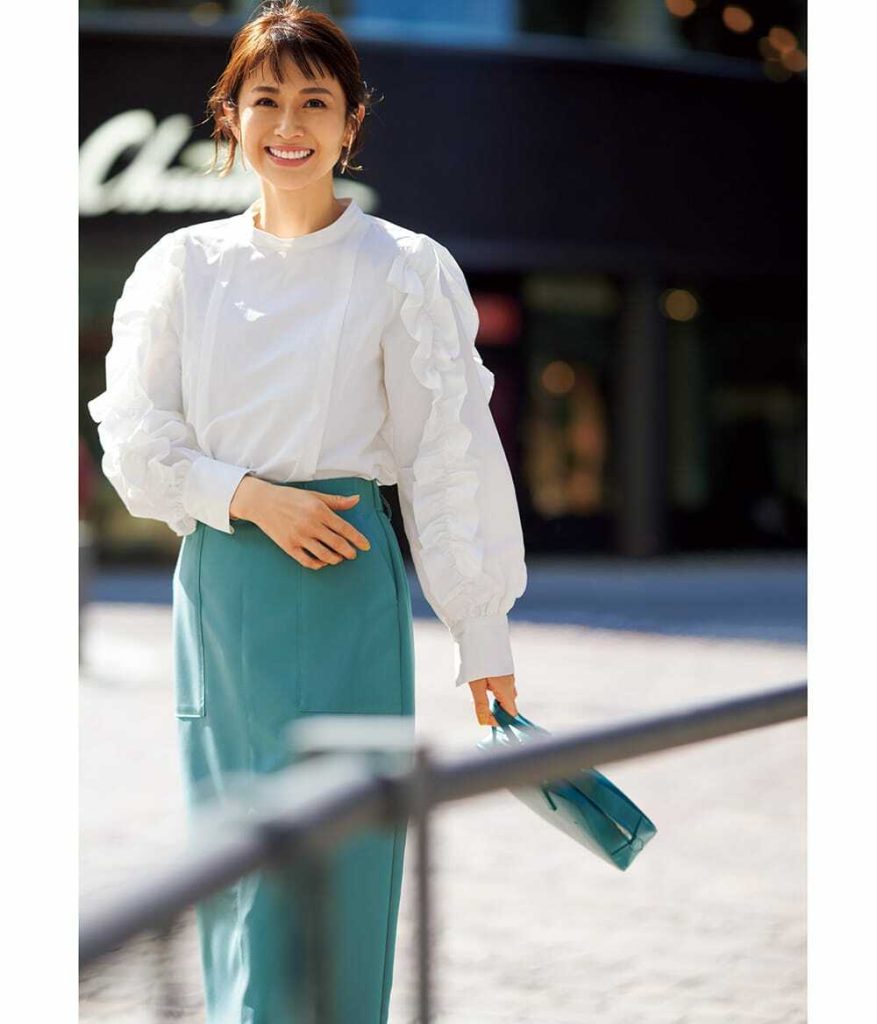 袖フリルブラウス¥6,600(オペーク ドット クリップ)タイトスカート¥5,489(VIS)バッグ¥25,300(ヤーキ/ヤーキ オンラインストア)バーピアス¥28,600(blanc iris/マルティニーク ルコント ルミネ有楽町)