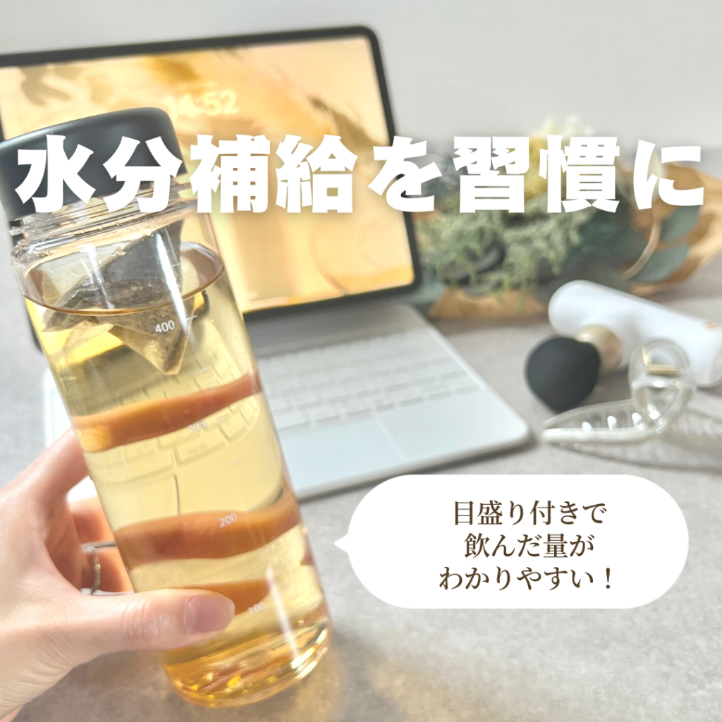 仕事に集中していると、ついつい水分補給するのも忘れてしまうんですよね。このドリンクボトルをデスクの上に置いて、いつでも水分補給できるようにしています。