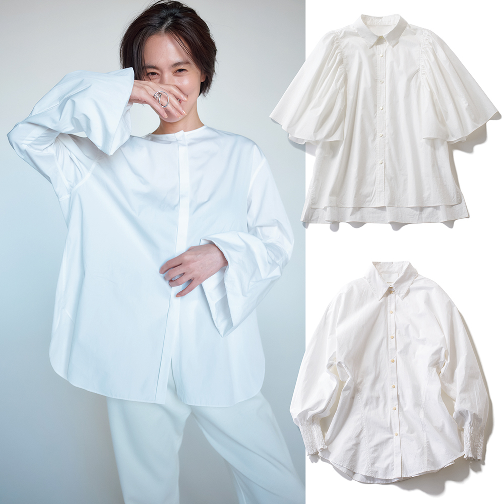 体のラインを拾わないワイドシルエットと、ふんわりフレアスリーブで、ブラウス感覚で着やすい一枚。特にシャツに苦手意識のある人はバンドカラーを選ぶのもおすすめ。