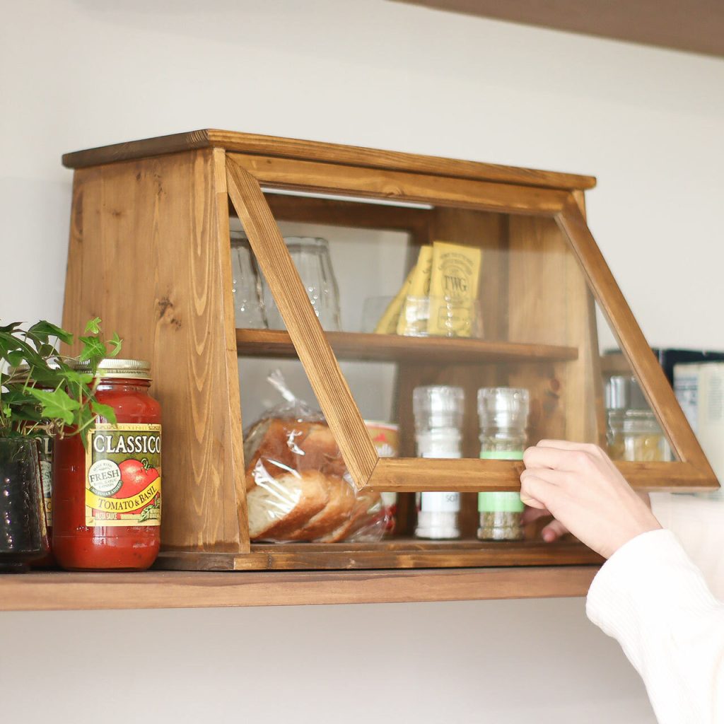 キッチンカウンターに飾るだけで、アンティークな雰囲気が演出できるこのキャビネット。朝食用のパンやお気に入りのグラスを並べれば、まるでお店のように。