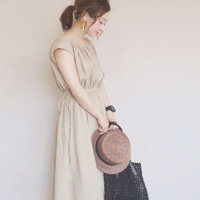 ライトベージュは肌なじみがよく、明るい色で夏らしさアップ。個性的なハットでレディな表情に。飽きの来ないデザインです。