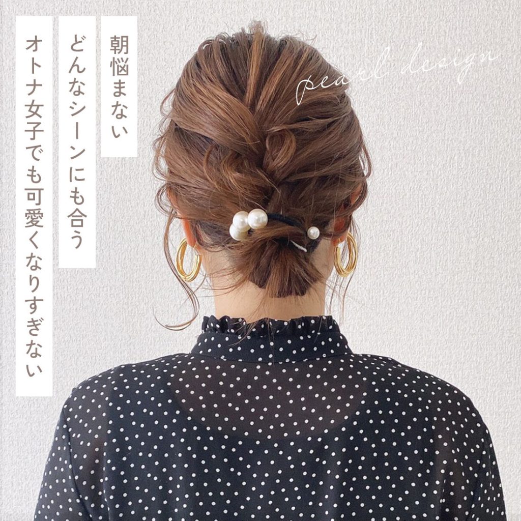 大小サイズの違うパールがあしらわれたヘアゴムです。ミディアム~ロングヘアの方にとって夏はまとめ髪が多くなる季節。このヘアゴムを使うだけで、こなれ感もアップします。