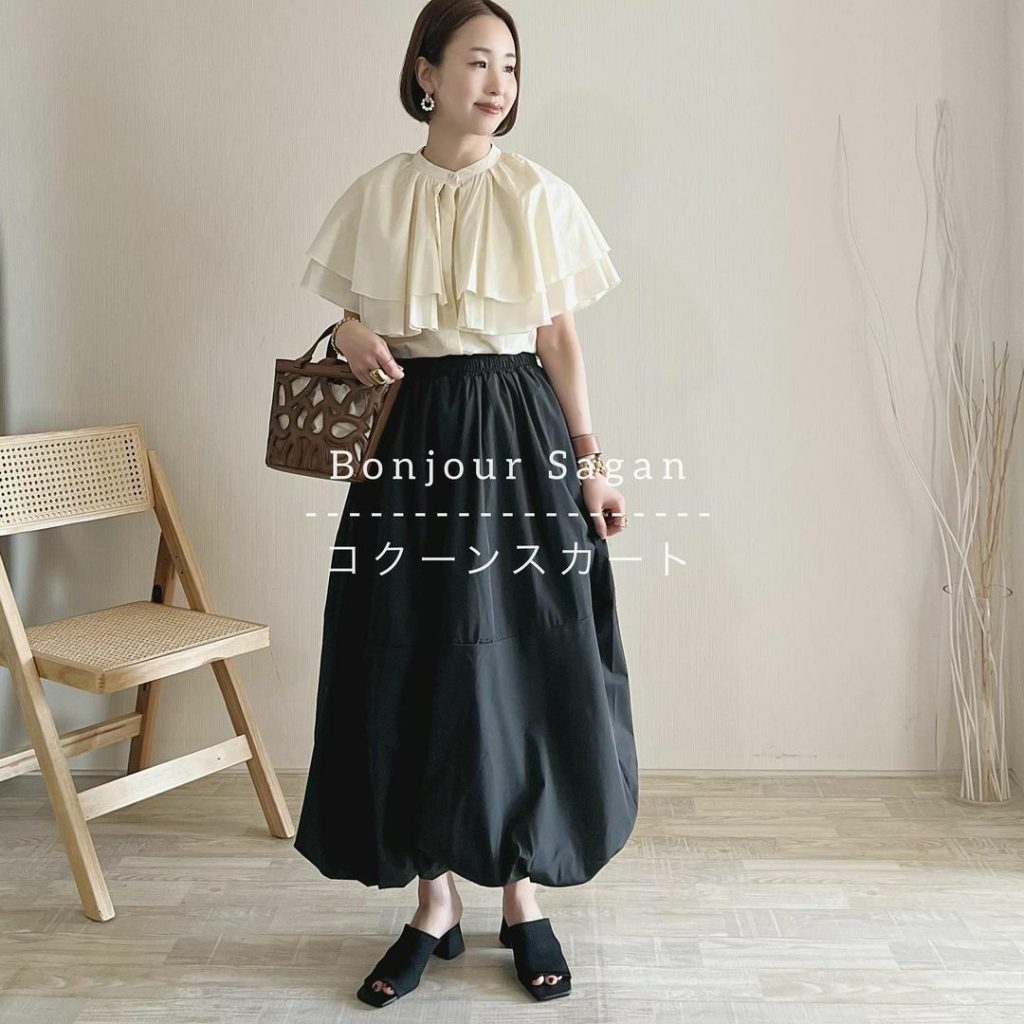 ボリュームのあるスカートでも、軽やかなタフタ素材なら夏らしく着こなせます。こちらは、裾まで丸みのある形がかわいいコクーンシルエットのスカート。体型カバーにもなります。