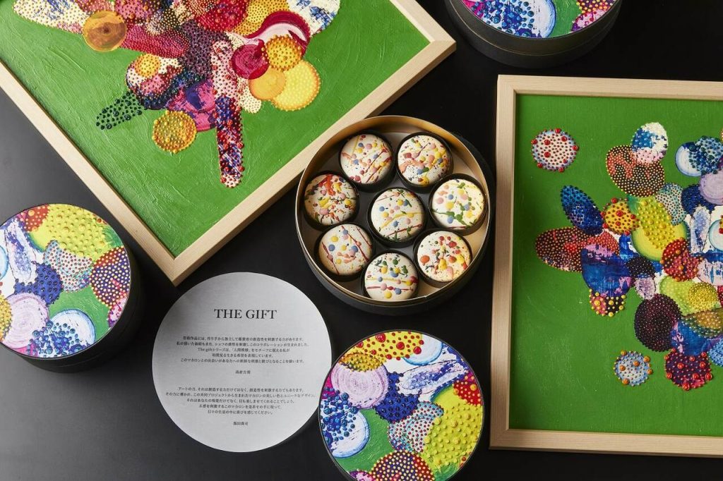 「芸術作品には、作り手から独立して鑑賞者の創造性を刺激する力があります。私の描いた油絵もまた、シェフの感性を刺激しこのコラボレーションが生まれました。The giftは、『人間模様』をモチーフに据える私が垣間見る生きる希望を表現しています。このマカロンとの出会いがあなたへの新鮮な刺激と歓びとなることを願います。」とコメント。今回はマカロンだけでなくパッケージにも髙倉氏のデザインを起用しています。