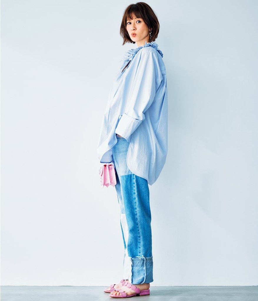 ブルーシャツとデニムという着慣れたアイテムのワントーンにピンク小物を効かせるスタイリングは即マネできそう。リラクシーな中にもキャッチーな小物でママ友との会話も弾みます。