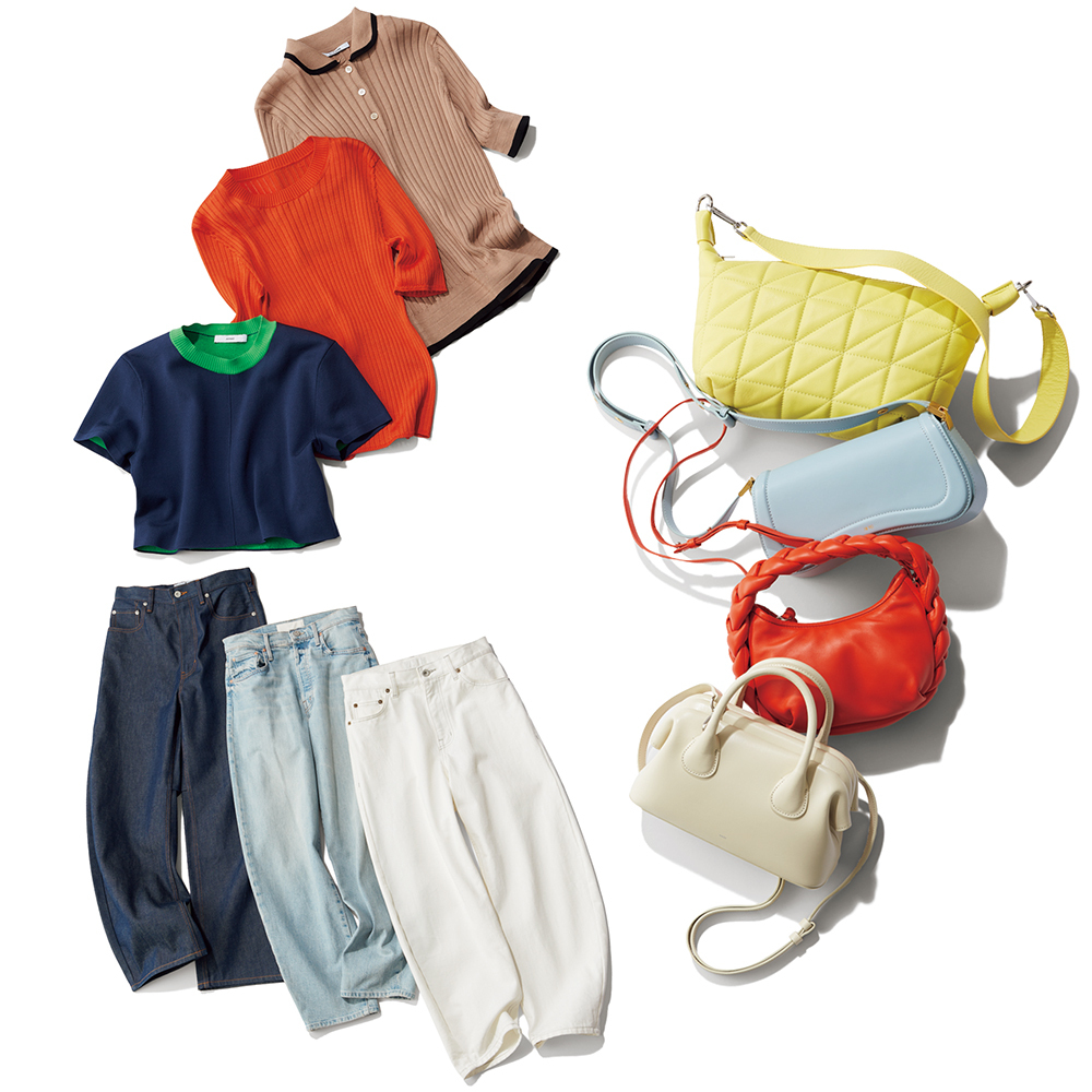 デニムパンツ¥20,900(アルページュストーリー) ニット¥8,910(ミラ オーウェン/ミラ オーウェン ルミネ新宿2店) キャップ¥990 ベルト¥990(ともにGU) ピアス¥8,800(アビステ) ネックレス¥10,780(エイチアッシュ/フォーティーン ショールーム) バッグ[18×11.5×4]¥31,900(VASIC/ヴァジックジャパン) サンダル[H1.5]¥36,300(ロランス/ザ・グランドインク)
