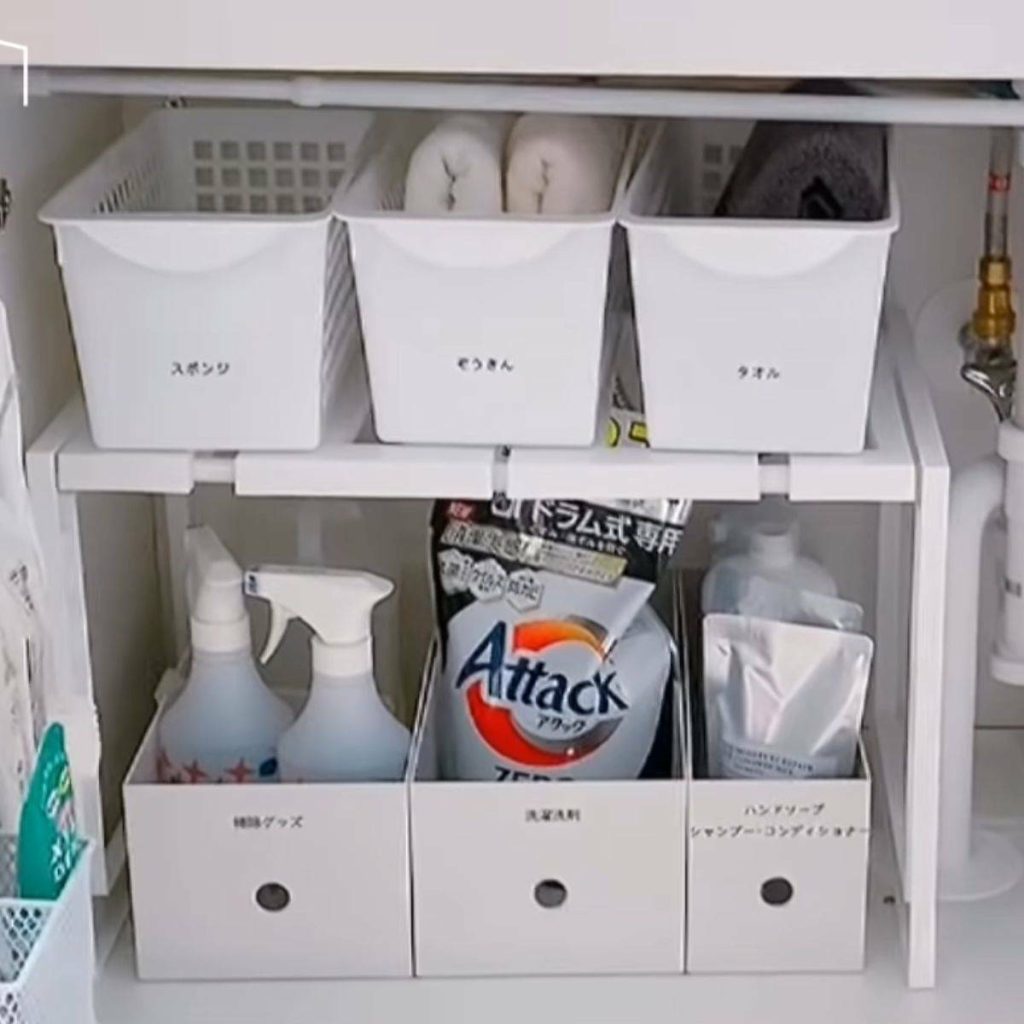 赤工さん宅の洗面台下収納は高さがあるため、ニトリの「伸縮フリーラック クラネを」設置。上下に収納できるようにしています。上段にはDAISO(ダイソー)の収納ケースを並べ、タオルやぞうきんなどの収納スペースに。