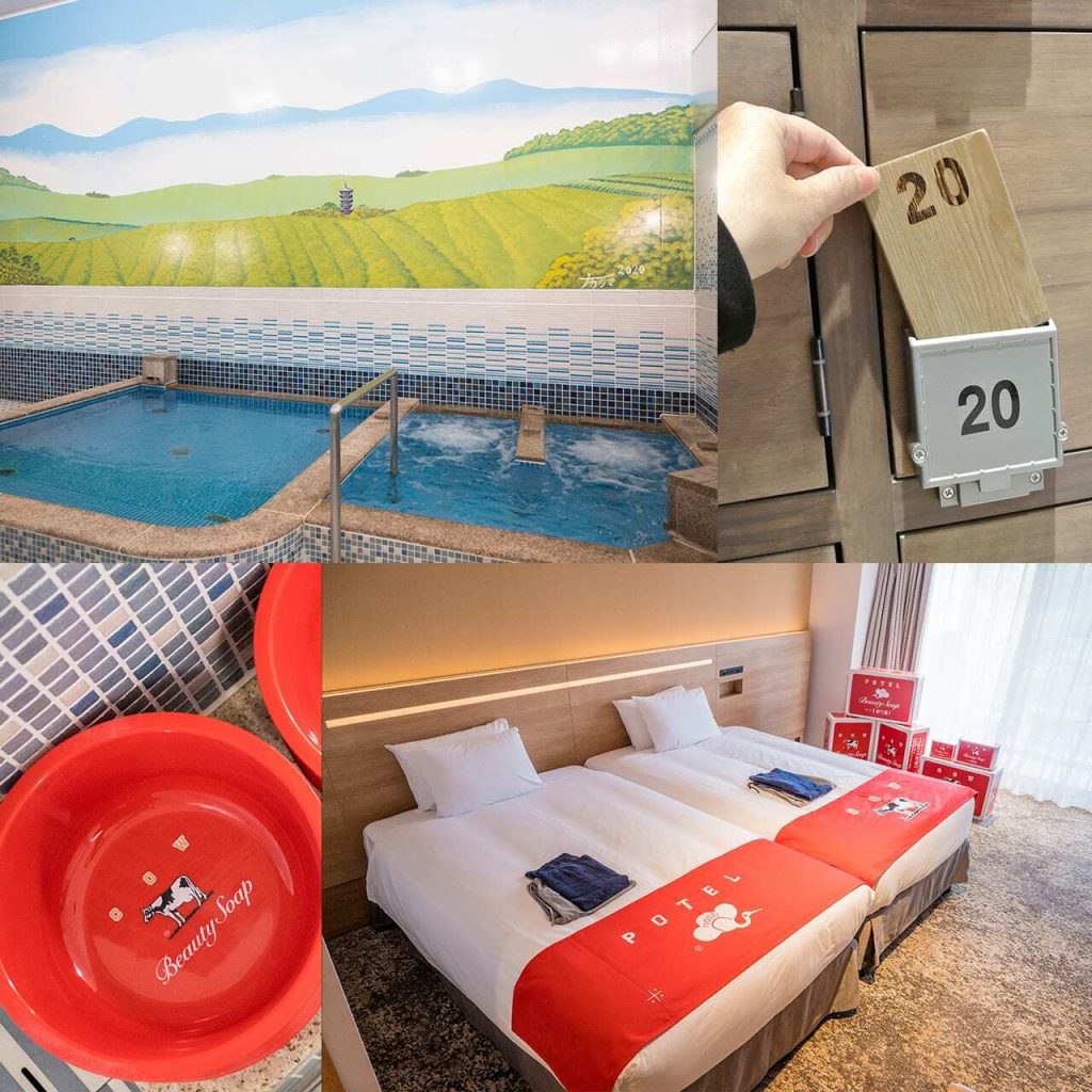全客室に用意された固形石鹸や、銭湯の洗面器など、ポテル京都とコラボする牛乳石鹸。さらに1日1室限定の「赤箱Room In Potel」も用意されています。