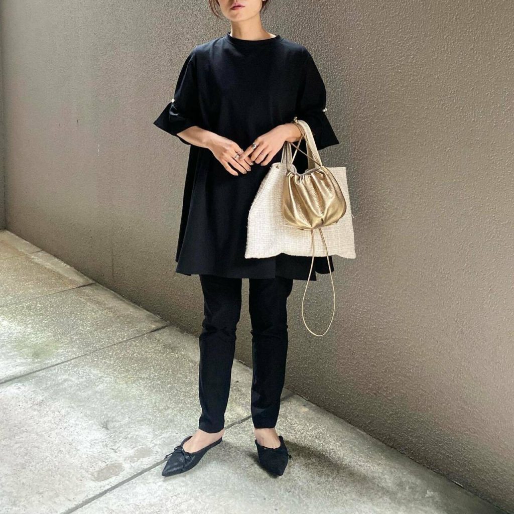 肌寒い日もあるので、トップスには5分袖×チュニック丈の黒ブラウスを選ぶと◎