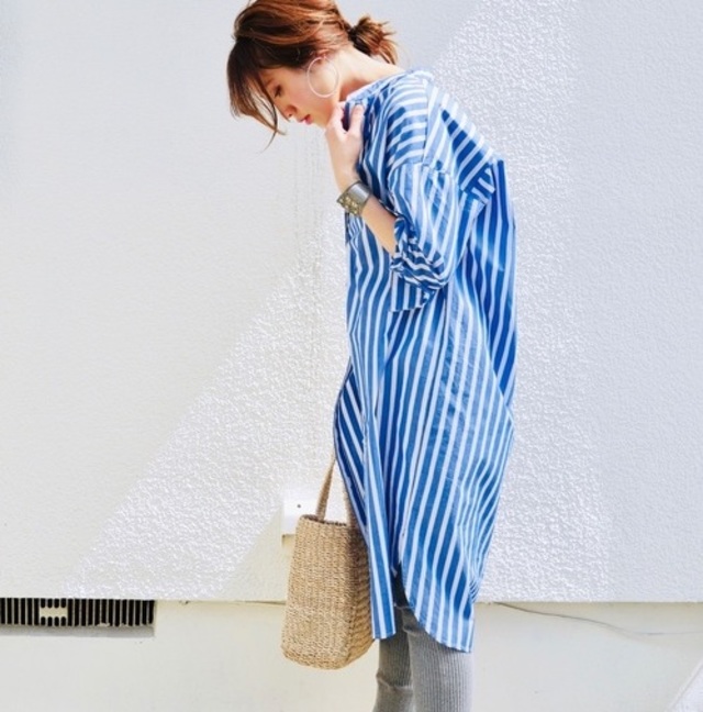コットン100%の素材は軽く、シアー感が夏にぴったりなアイテムです。ロング丈で体型カバーも叶えてくれ、前ボタンを開けて羽織りとしても活躍するアイテムです。