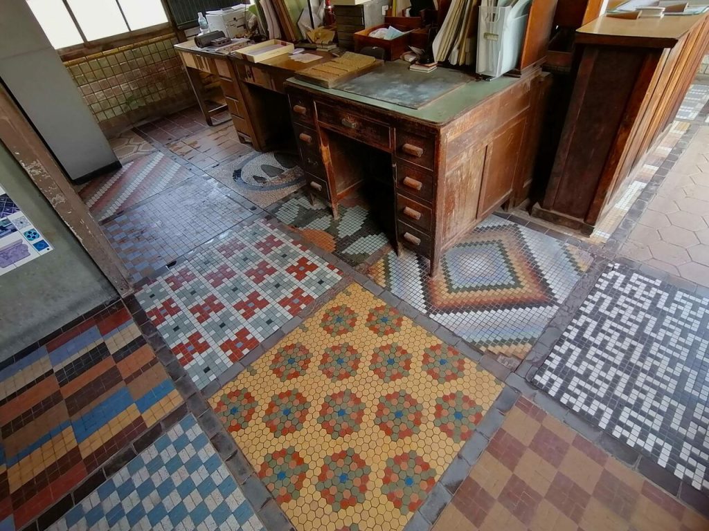 昭和3(1928)年に建てられた旧杉江製陶所の事務所兼見本室は、当時から時間が止まったままのよう。16畳半ほどの見本室の床や壁は、さまざまなタイルでできた約82cm四方のパネルで彩られていました。タイルひとつひとつのレトロな色合いやデザインに、思わず見入ってしまいます。