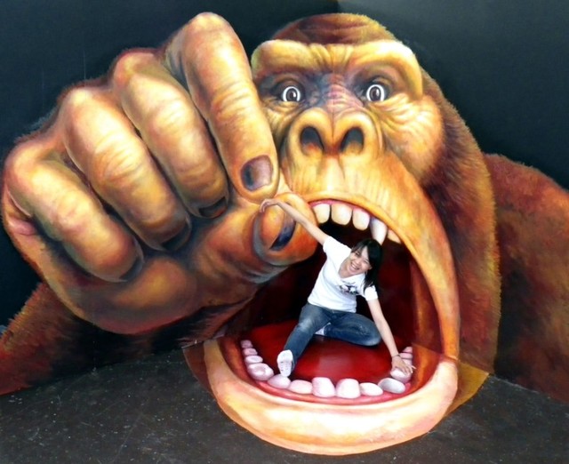 赤い壁と緑の出窓が印象的な外観