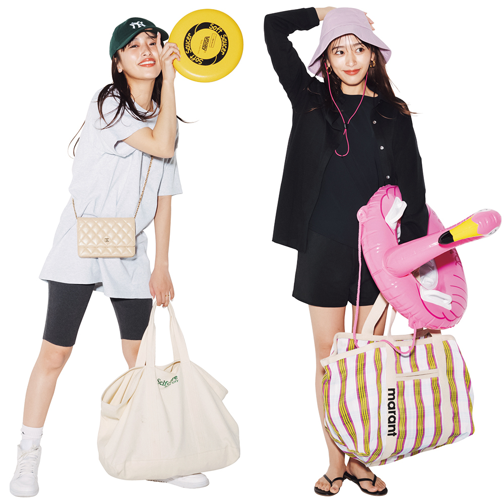 ビッグTにバイカーショーツでトレンドのスポーティを満喫! くたっとしたビッグトートはレジャーや公園の相棒。レジャーシートやお砂場セットなどをザクザク入れています。