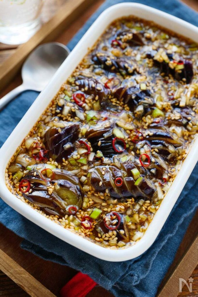 焼いて漬けるだけ!やみつき必至♡蛇腹なすの麻薬卵風ピリ辛漬け | レシピサイトNadia
