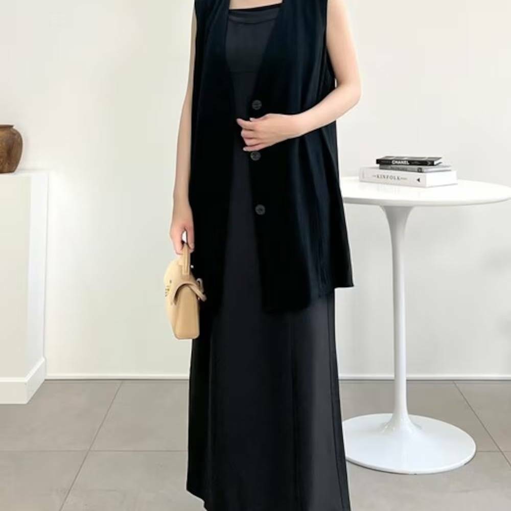 ブラックのベストとスカートをセットアップできるカジュアルコーデは、こなれ感があって40代の大人女子にピッタリです!
