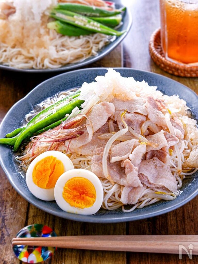 お肉も野菜もたっぷりおいしく食べられる、さっぱりした味わいの素麺。基本具材はレンジで簡単に作れます。大根おろしを乗せ、ゆで卵や香味野菜を添えてどうぞ。