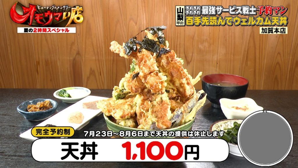 「天丼」は、エビやアジなど10種類以上の天ぷらが盛られて1,100円という安さ!山のようにそびえ立つ盛り付けに、ヒロミさんは「予約じゃないとこの盛り付けできない」と笑いを誘います。