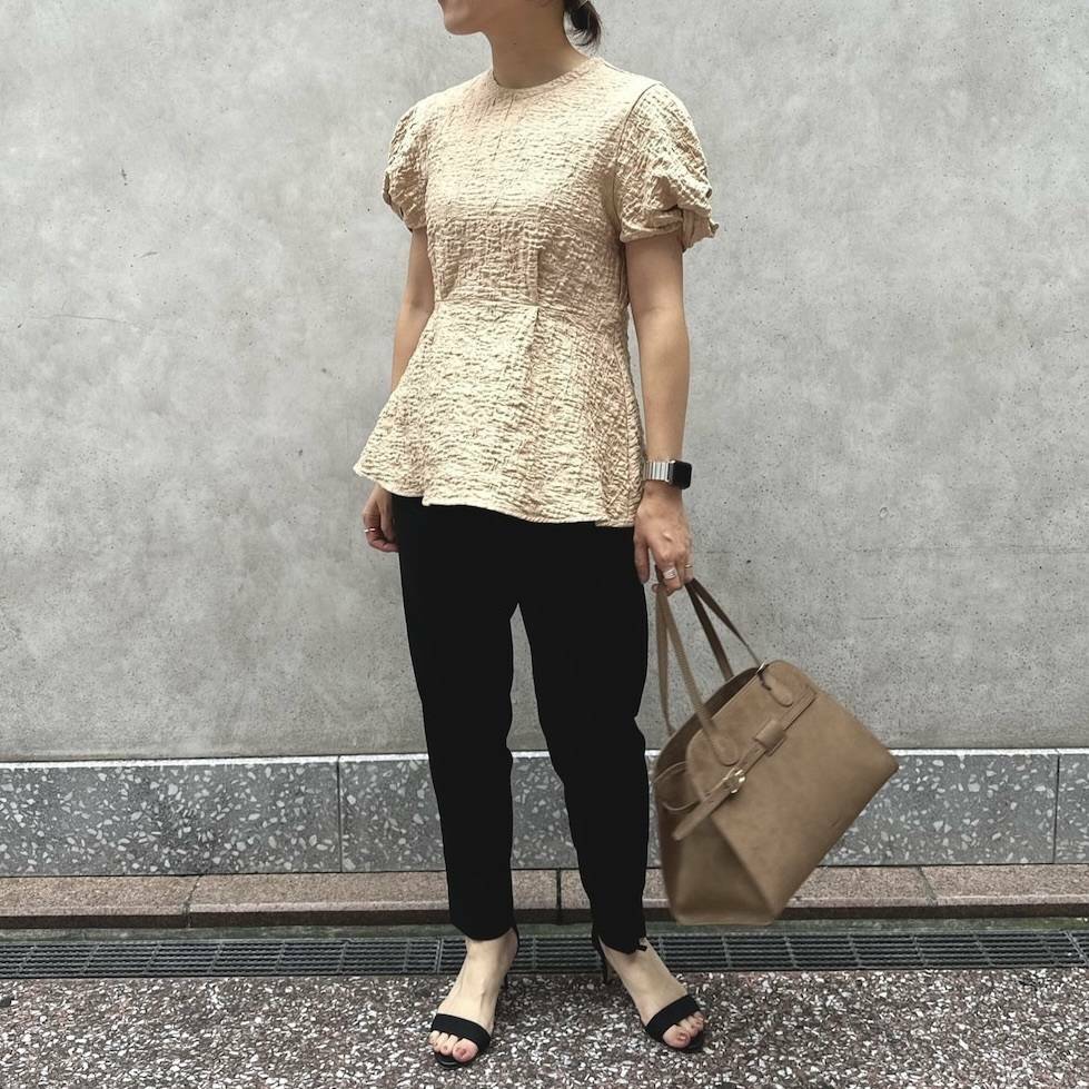 【2023夏】痩せて見えるブラウスコーデ⑤ペプラムブラウス×黒パンツ