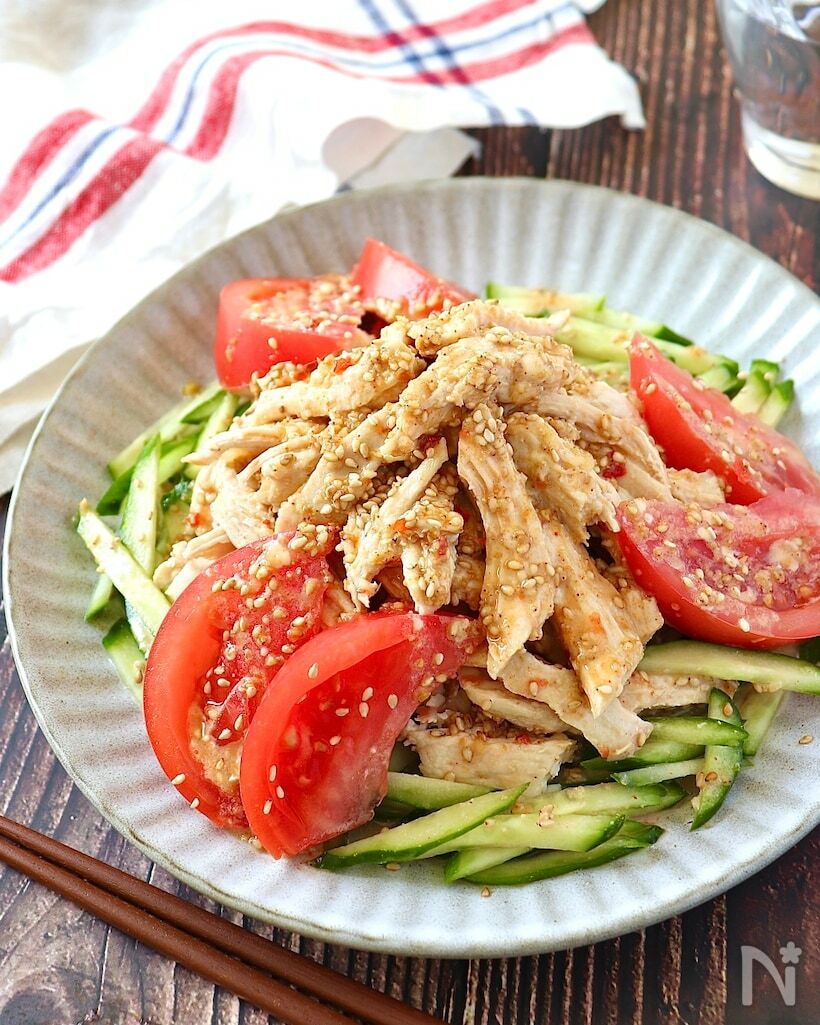鶏むね肉と夏野菜で、おいしくてヘルシーな棒棒鶏が作れます。鶏むね肉をレンチンしてほぐして切った野菜を盛り、特製マヨだれをかければ出来上がり。コクがあって後味さっぱりで絶品です。