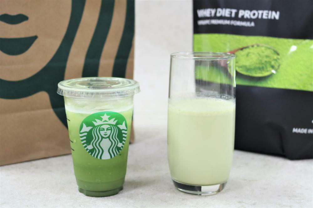 今回飲み比べるのは、スターバックス「抹茶 ティー ラテ」(ショート、税込452円)と、ULTORA「ホエイダイエットプロテイン 抹茶ラテ風味」(公式サイトでは、450gで税込2601円)の牛乳割りです。