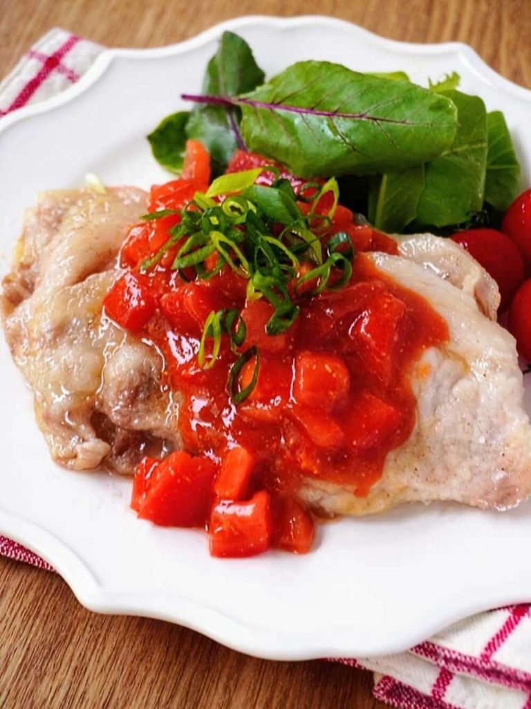 豚ロース肉にトマトソースをかけた洋食…かと思いきや、実はこってり風味のヤンニョムソース。見た目と味のギャップが楽しいとっておき料理です。生のトマトで作るソースはフレッシュな味わいでおいしいですよ。(調理時間:10分)