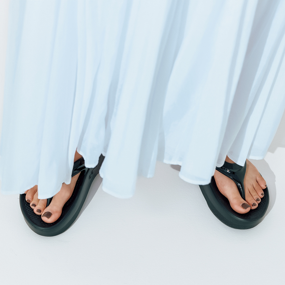 ヌーディーなつま先を活かせる、裾に動きのあるマキシやワイドで女っぽくするのも手。コットンのふんわりとしたボリュームの甘さとウーフォスの無機質な素材感がベストバランス。
