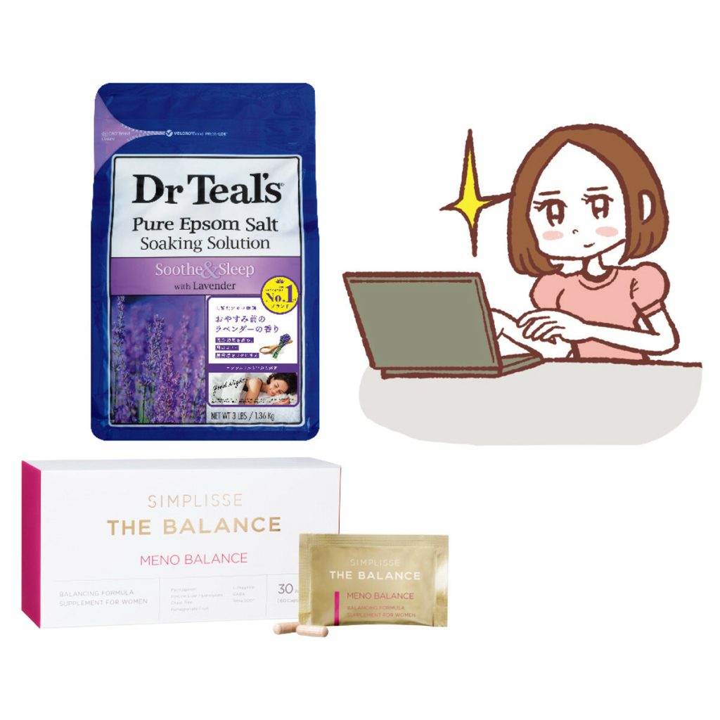 (上)ミネラルたっぷりでポカポカに。薬用入浴剤 ティールズ EPソルト ラベンダーの香り 1360g ¥1980/フィッツコーポレーション (下)ピクノジェノールなど不定愁訴に働きかける成分ぎっしり。シンプリス ザ バランス メノバランス 30袋 ¥9500/シンプリス