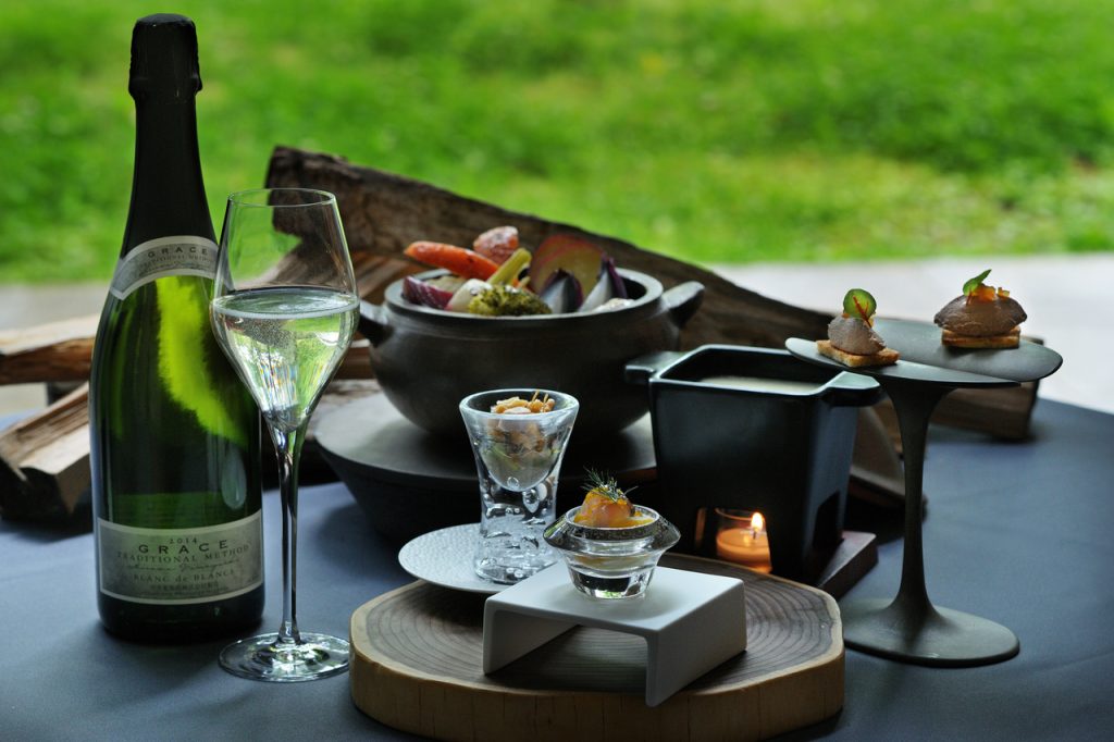 広々とした貸切のテラスで暖炉を囲み、ピアノの生演奏とともにアペリティフを楽しめます。食前酒には、「Grace Blanc de Blancs」(中央葡萄酒/山梨県甲州市)と自然の恵みを活かした料理を用意しました。「Grace Blanc de Blancs」は、フレッシュな果実や可憐な花の香りを感じながらも、瓶内熟成によるトースト香や蜜香にも覆われた凛とした強さと大胆さが感じられるワインです。
