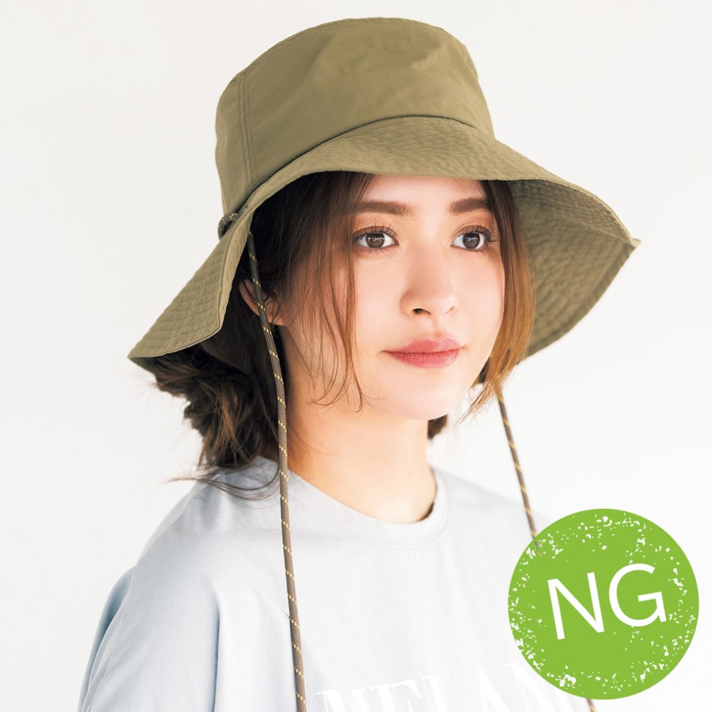 アウトドア用のハットに似合うのが、衿足に髪がかからないきっちりとしたシニヨン。衿元がスッキリしているので、顔周りの後れ毛を遊ばせて地味にならないようにアクセントを。