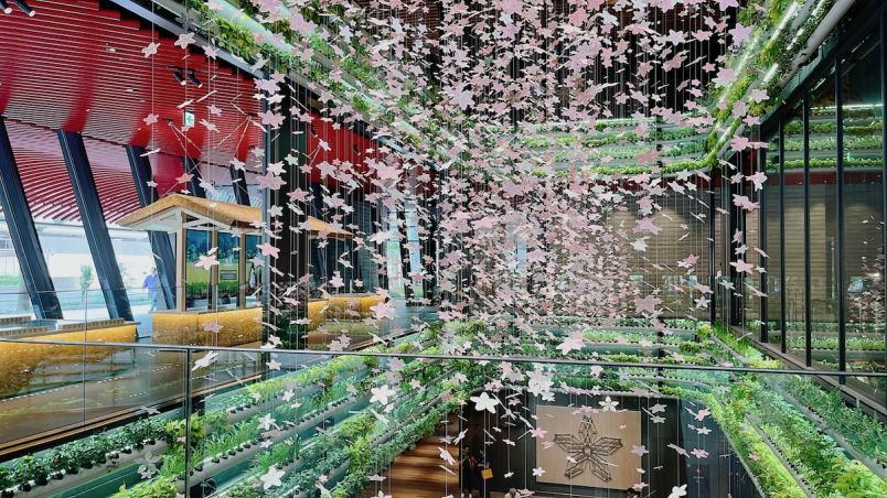 まず注目したいのが地下1階から2階の吹き抜けに華やかにふりそそぐ大量の桜の花。地下1階のイベントスペース「HANASAKA SQUARE」では、あらゆる人の新しい可能性が未来に向けて満開に咲き誇るイメージを表現したアートワークなど、クリエイティブディレクターの佐藤可士和氏監修の開放的な空間を楽しむことができます。