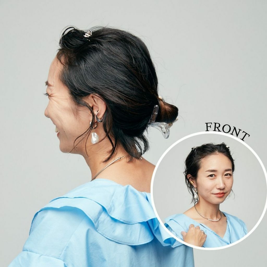 。怖がらずたっぷりのオイルで扱いやすいベースを作りましょう。短めボブをお団子にすると髪が落ちてきてしまいますが、オイルをつけておくとそれもニュアンスとして生かすことができます。ゴムを使わないスピードクリップアレンジ、クセ毛さん必見です。