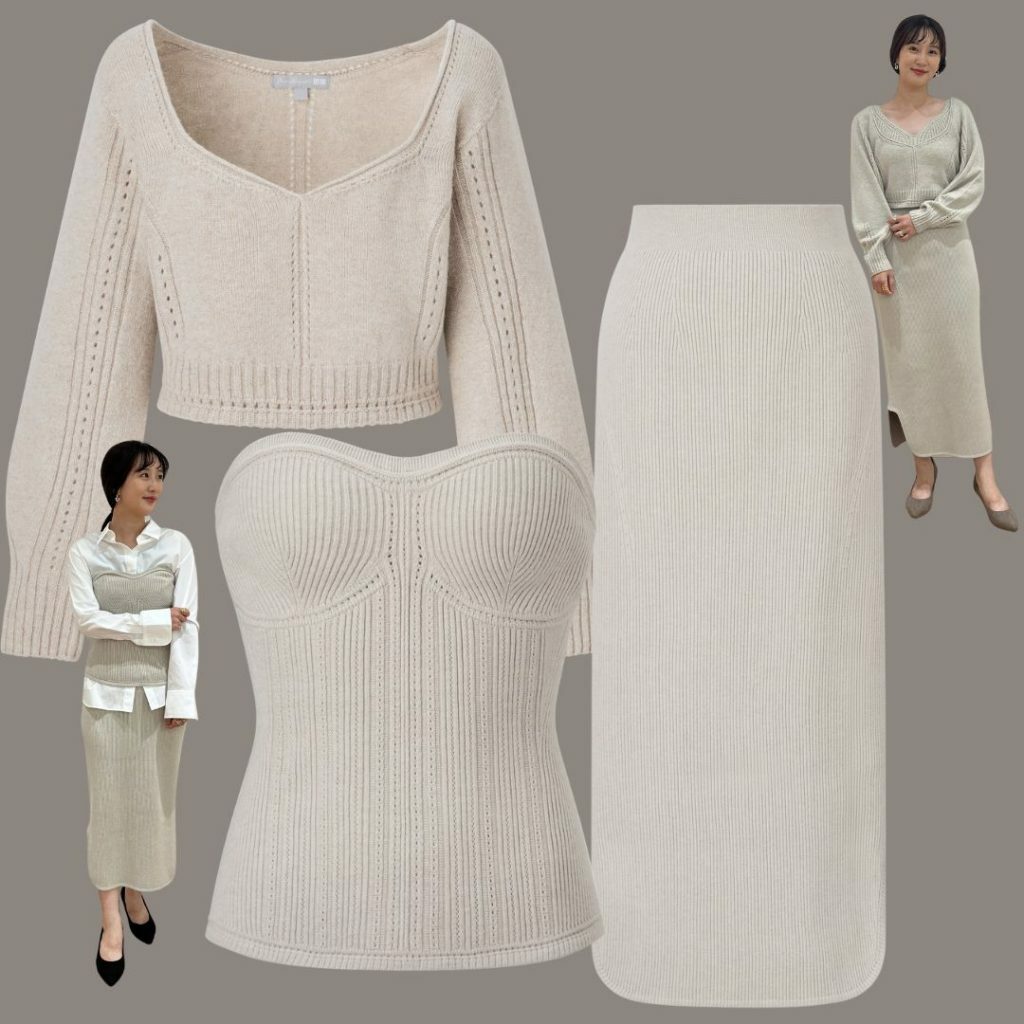「ビスチェニットとスカートは、上下別々ではもちろんセットアップでも着用可能。繊細なリブ編みで着痩せ効果もあり。伸縮性があるのでレイヤードや立ったり座ったりの動作も苦になりません。タイトスカートは両サイドにスリットがあるので足捌きがいいのも高ポイント!」3Dスフレヤーンリブビスチェスムース¥2,990 3Dスフレヤーンリブサイドスリットスカート¥4,990(ともにユニクロ アンド マメクロゴウチ/ユニクロ)