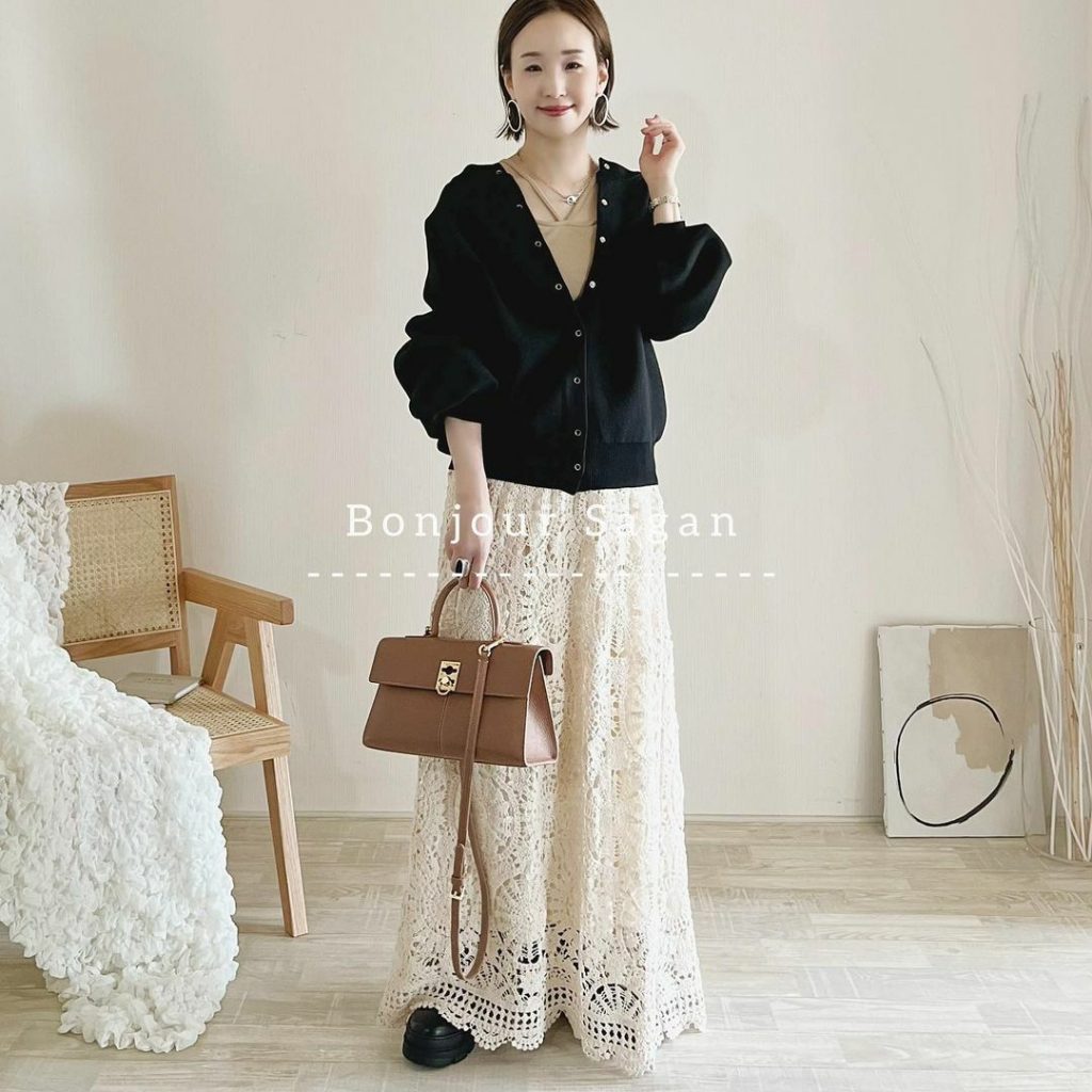 さりげないフレア袖が上品なアクセントになるリブニットも、秋の大人コーデにぴったりなアイテム。黒ニットは着回し力が高いです。夏っぽいブルージーンズと季節感ミックス、ボアジレで秋らしさアップなど自分らしく着こなしましょう。