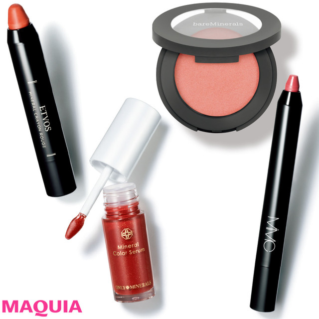 C しなやかなミモザオレンジ。頬の内側から外側へ楕円形にふんわり。エクセル シームレストーン ブラッシュ SB03/常盤薬品工業 D 赤みを感じるソフトマットなベージュブラウン。直塗りで唇全体に。キスミー フェルム ソフトマットルージュ 05/KISSME(伊勢半) E ショコラベージュを全ての指に。ネイルホリック リミテッドカラー BR336(価格は編集部調べ)/コーセーコスメニエンス(限定品)