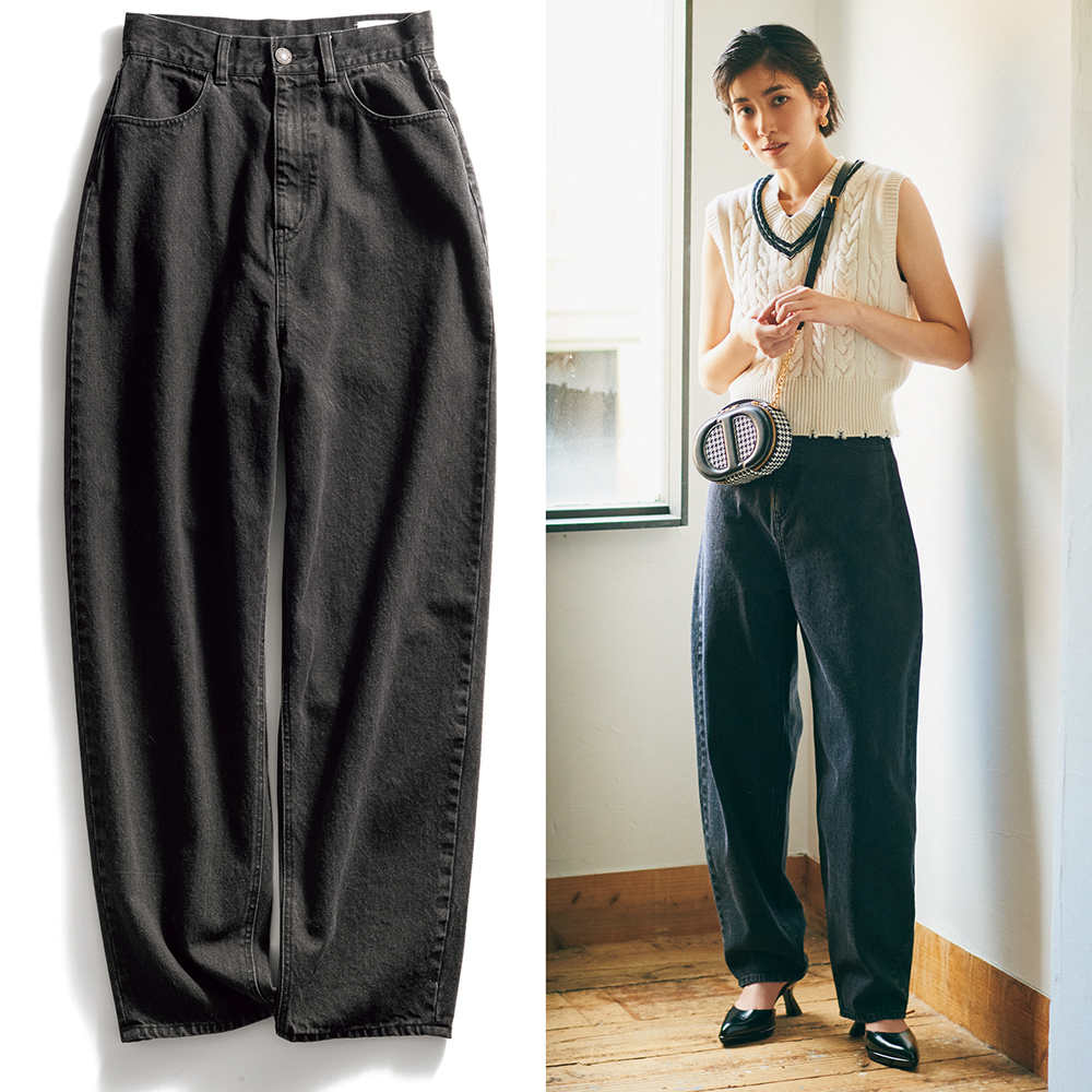 元祖カーブデニムからクラッシュタイプが登場。立体感のある、ゆるシルエットが抜群に今っぽい。シンプルトップスもこれ一枚で垢抜けるので、色違いで買う人も続出。