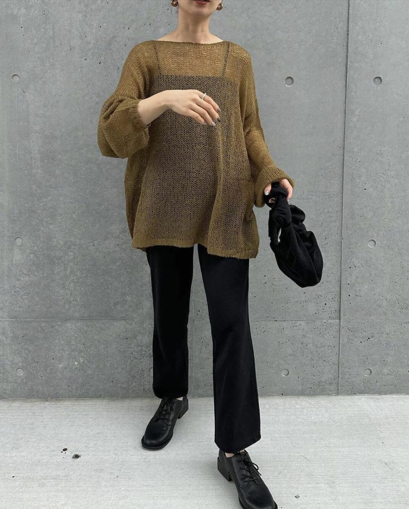 キャミソールやタンクトップだけでなく、ワンピースと重ね着もこなれていておしゃれです。黒のキャミワンピには、アイボリーのメッシュニットを合わせて色でメリハリ◎。ワンピースの美シルエットが引き立ちます。