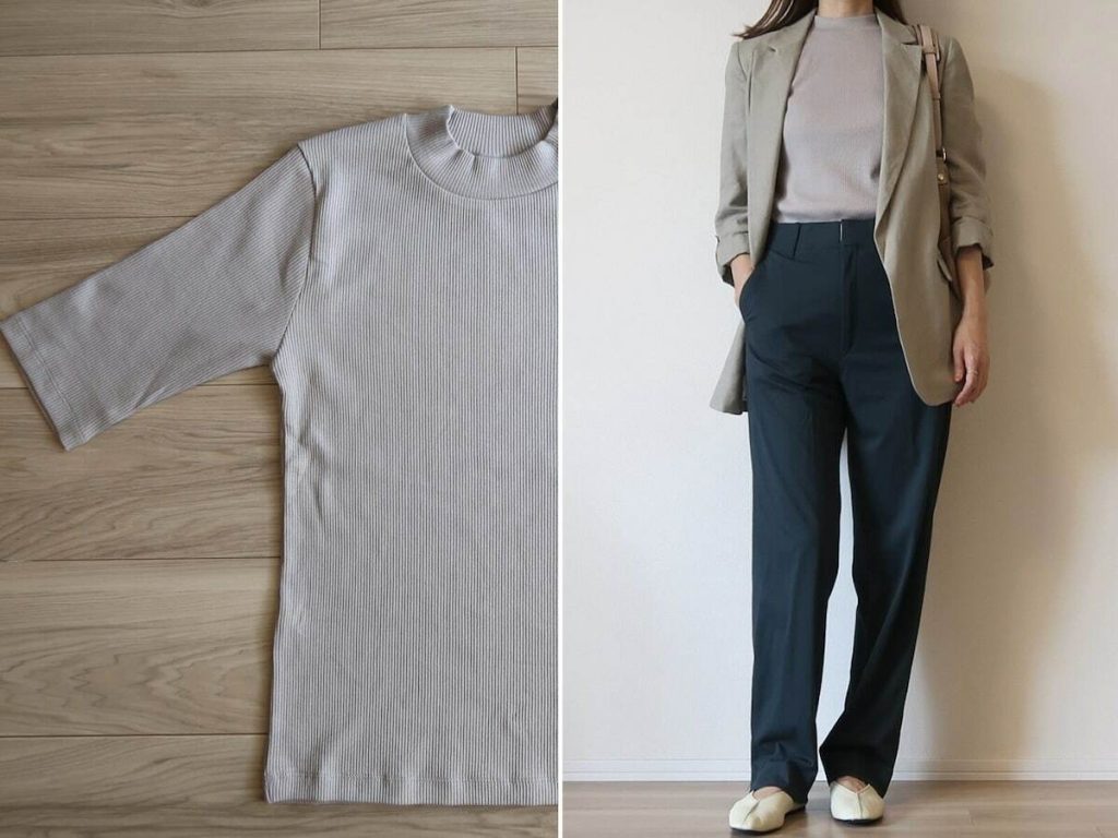 長めの袖が優秀! 無印良品の「ハイネック五分袖Tシャツ」
