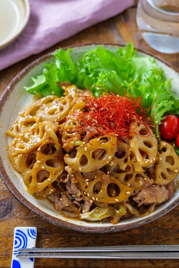 秋から冬が旬のれんこんを使った炒め物は、シャキシャキとした食感が楽しいです。豚こま肉を合わせて食べごたえもアップ。醤油、酒、砂糖というシンプルな調味料の甘辛い味つけはご飯によく合います。(調理時間:10分)