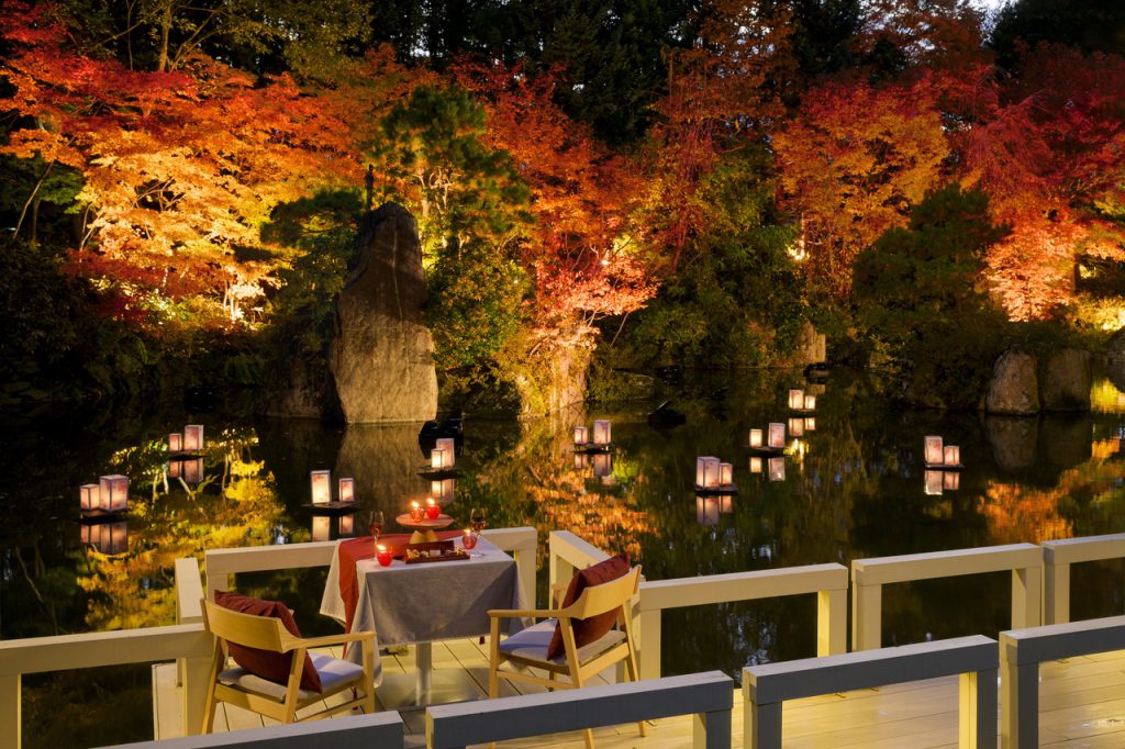 ライトアップされた夜の「津軽四季の水庭」に、紅葉をイメージした灯篭が浮かび、鮮やかな紅葉は昼間とは違った幻想的な風景へと変化します。一日一組限定の貸し切り席で、明かりによってさらに美しい色合いを見せる紅葉や、風情を感じる水面に映る紅葉を眺めながらゆったりとしたプライベート空間を楽しむことができます。