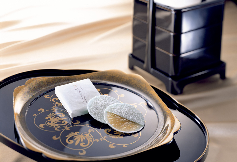 3代目の三郎平は、その情景を非常に好んだそうで、「江出の月」がほのかに青いのは、水面に映った満月の姿であるため。粉糖と卵白を泡立てたメレンゲ状のものを表面に吹き付けた白い点々の「すり蜜」は、さざ波を表しています。