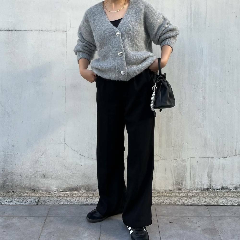 グレーのカーディガンは、深めのVネックを選ぶと◎