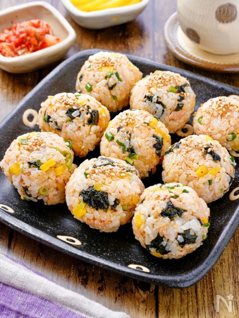 ツナマヨ・たくあん・キムチなどを細かく切って混ぜ込んだ韓国風おにぎり。コロンと可愛くて、お弁当箱を開けた瞬間から幸せになれます。具沢山で華やかでおいしい素敵なレシピです。