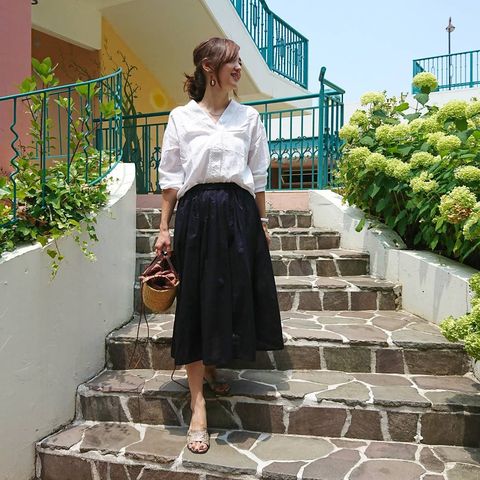スウェット¥25,300(サードマガジン)スカート¥19,800(ミースロエ)バッグ¥15,400(ケッシュ ル エッセンシャル)サンダル¥4,990(ザラ/ザラ カスタマーサービス)ピアス¥17,600(リューク)