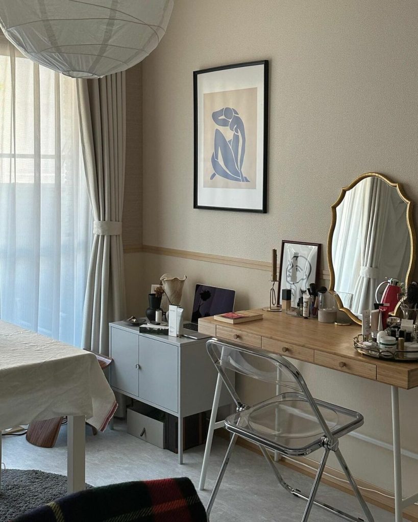 IKEAのテーブルとZARA HOME のミラーを組み合わせて作ったドレッサースペースもお気に入り。イサムノグチのAKARIは、床の上や机の上などいろんな場所に置いて使われていて、あるだけで癒され、モダンな印象になるところが気に入っているそう。