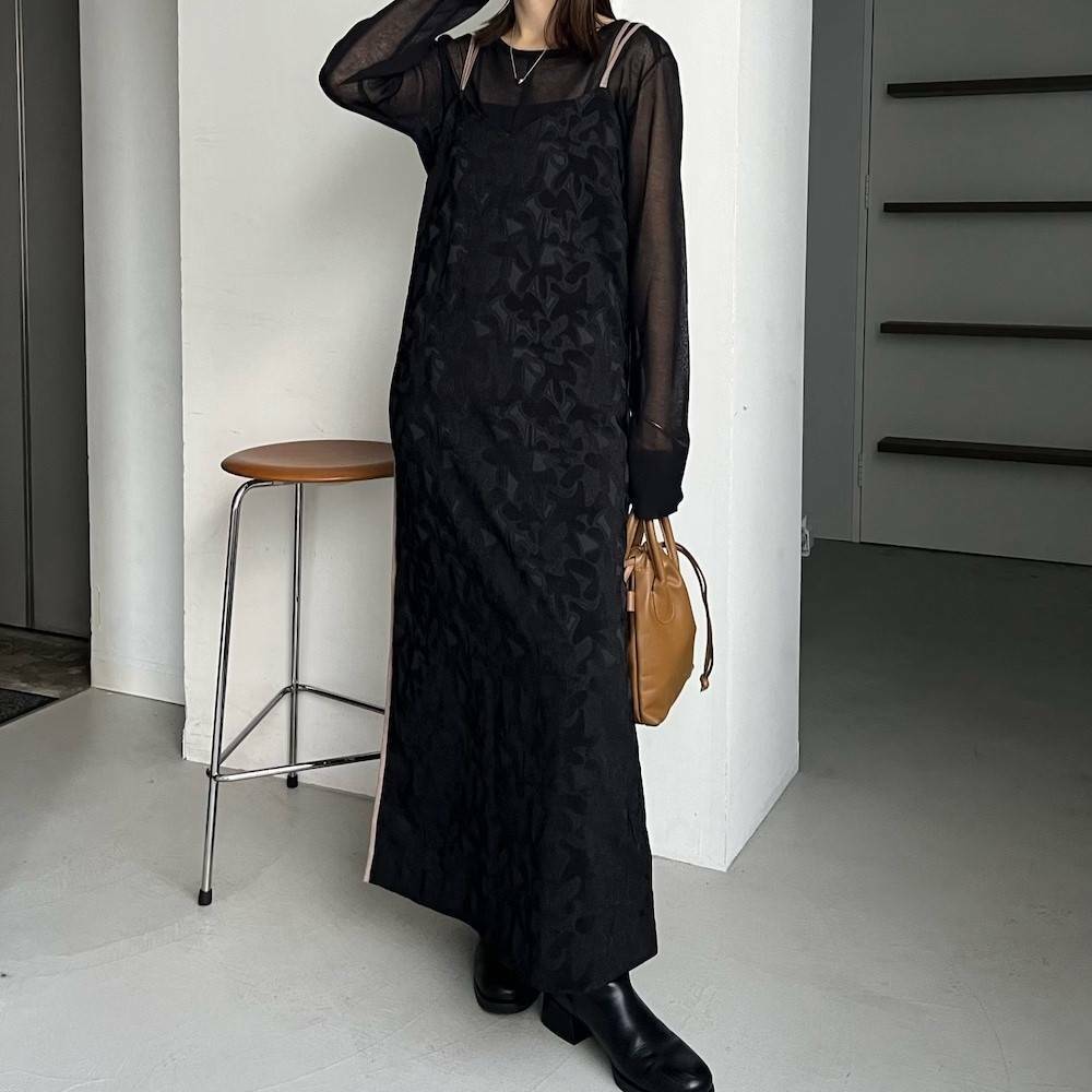 キャミタイプの黒ワンピースは、重ねるトップス次第でさまざまなイメージの着こなしを楽しめる優れもの♪