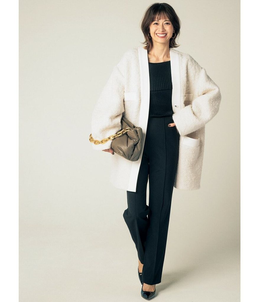 最近の暖冬もあってジャケット以上コート未満の、晩秋に着るような軽めのアウターの選択肢が広いです。私的には緩く織られたツイードが気になります(スタイリスト・竹村はま子さん)
